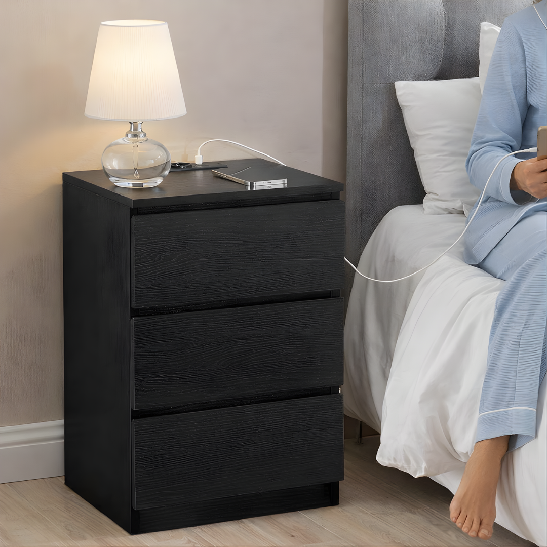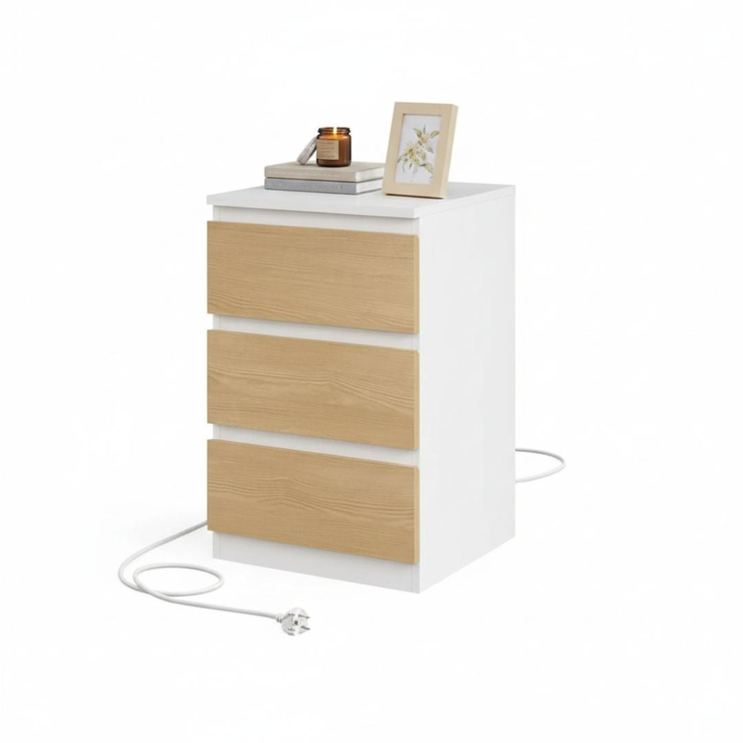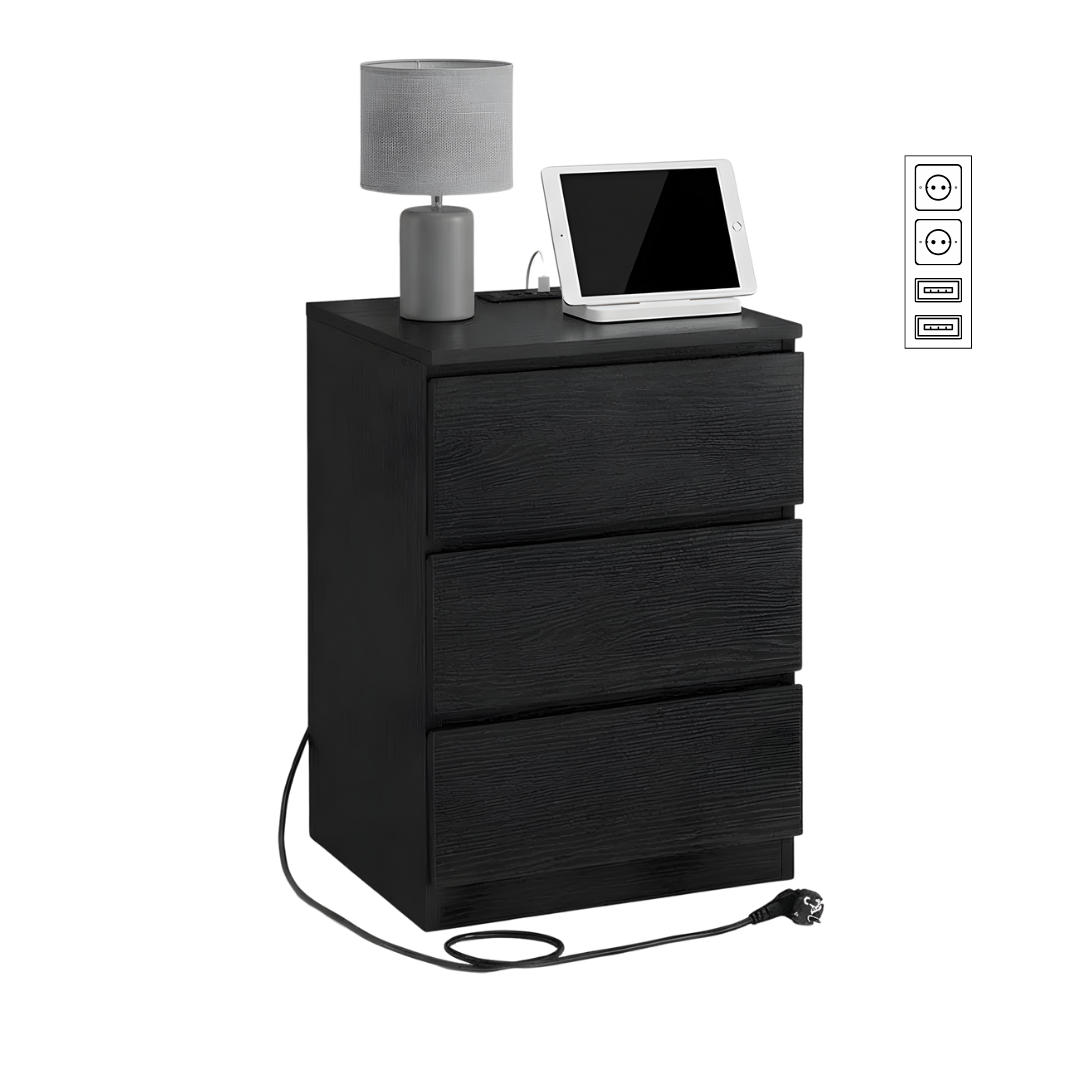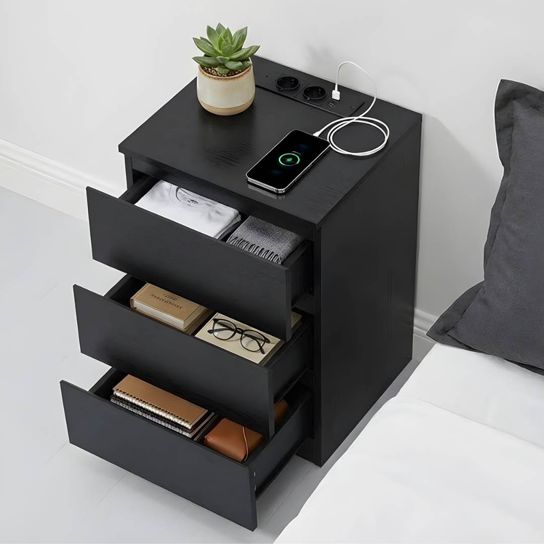 Deze bijzettafel heeft een eenvoudig rechthoekig ontwerp. Hij is voorzien van drie uittrekbare lades. Op het tafelblad kunt u spullen zoals een telefoon of klok plaatsen. De tafel heeft ingebouwde oplaadpunten.