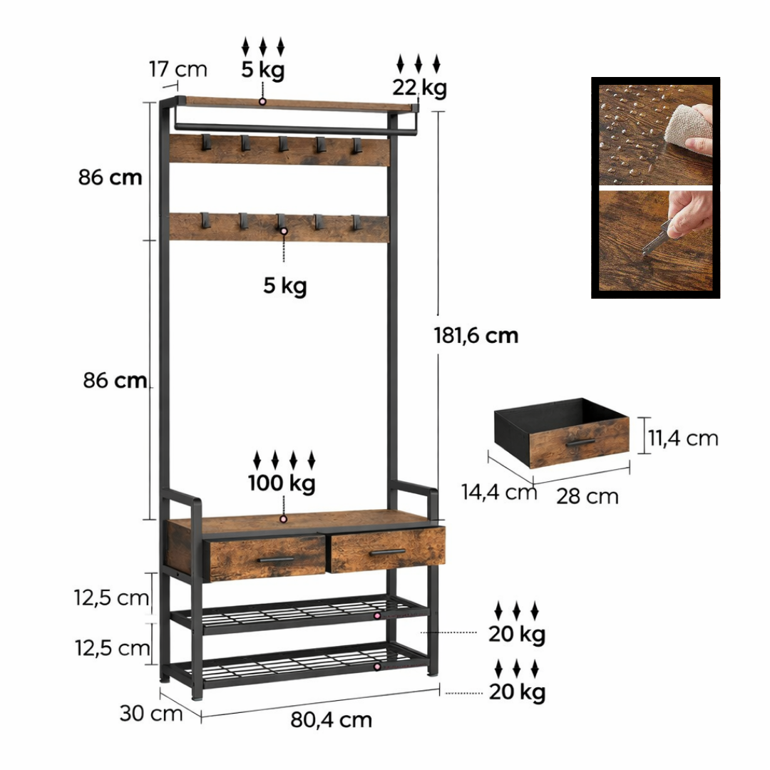 Deze kapstok combineert meerdere opbergfuncties in één unit. Bovenaan bevindt zich een vlakke plank met daaronder een horizontale kledingrail. Het achterpaneel onder de rail bevat meerdere haken om items aan op te hangen. In het middelste gedeelte is een bankoppervlak aanwezig met twee ingebouwde lades eronder. Onder de lades bevinden zich open planken voor het opbergen van schoenen.