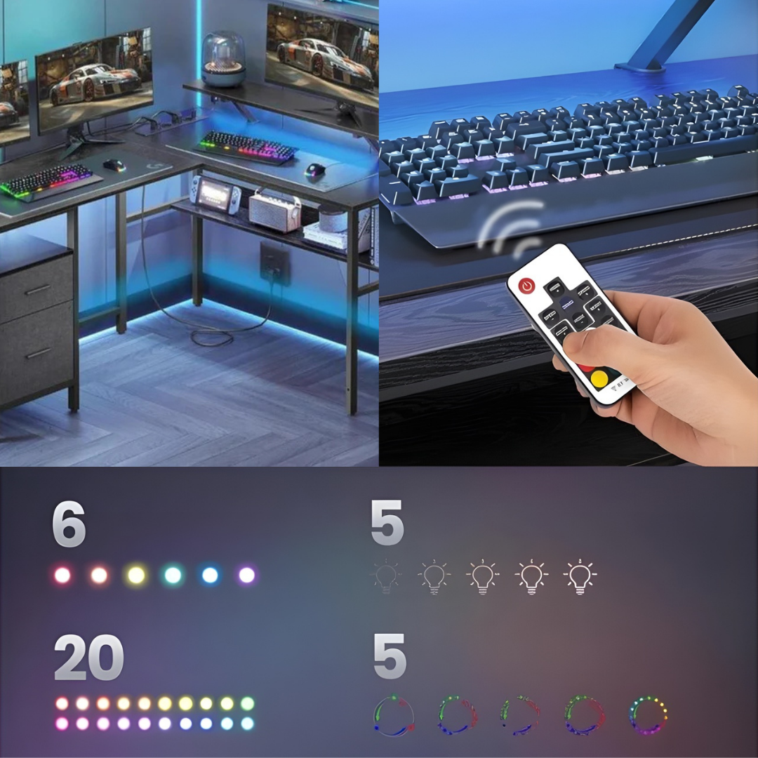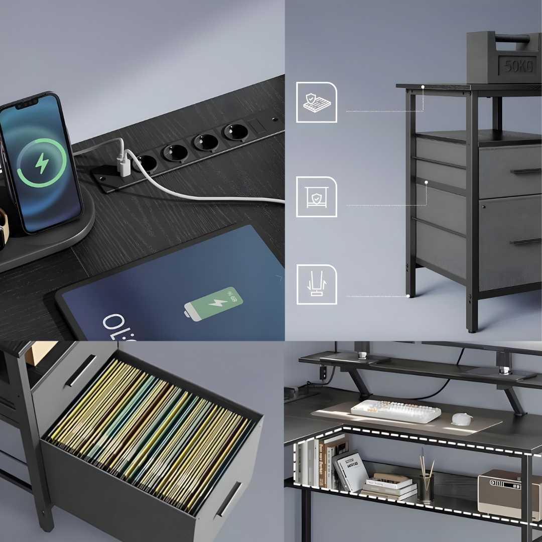 Dit L-vormige bureau heeft een geïntegreerde plank die langs één zijde van het werkblad loopt. De verhoogde plank is ongeveer 14 centimeter boven het bureaublad geplaatst en biedt een aangewezen ruimte voor een computermonitor. Onder dit verhoogde gedeelte is een ingebouwde lichtstrip geïnstalleerd die de werkruimte verlicht en kan worden aangepast met een kleine handafstandsbediening. Het bureau beschikt ook over een ingebouwde stekkerdoos met meerdere stopcontacten en USB-poorten die direct op het werkblad zijn geplaatst. Aan één uiteinde van het bureau bevindt zich een verticale opbergeenheid met twee laden.