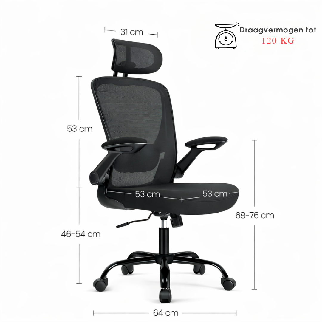 Verstelbare hoofdsteun: De hoofdsteun bevindt zich aan de bovenzijde van de stoel en kan in verschillende hoeken worden aangepast. Deze volgt hetzelfde meshmateriaal als de rugleuning.