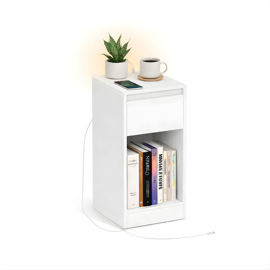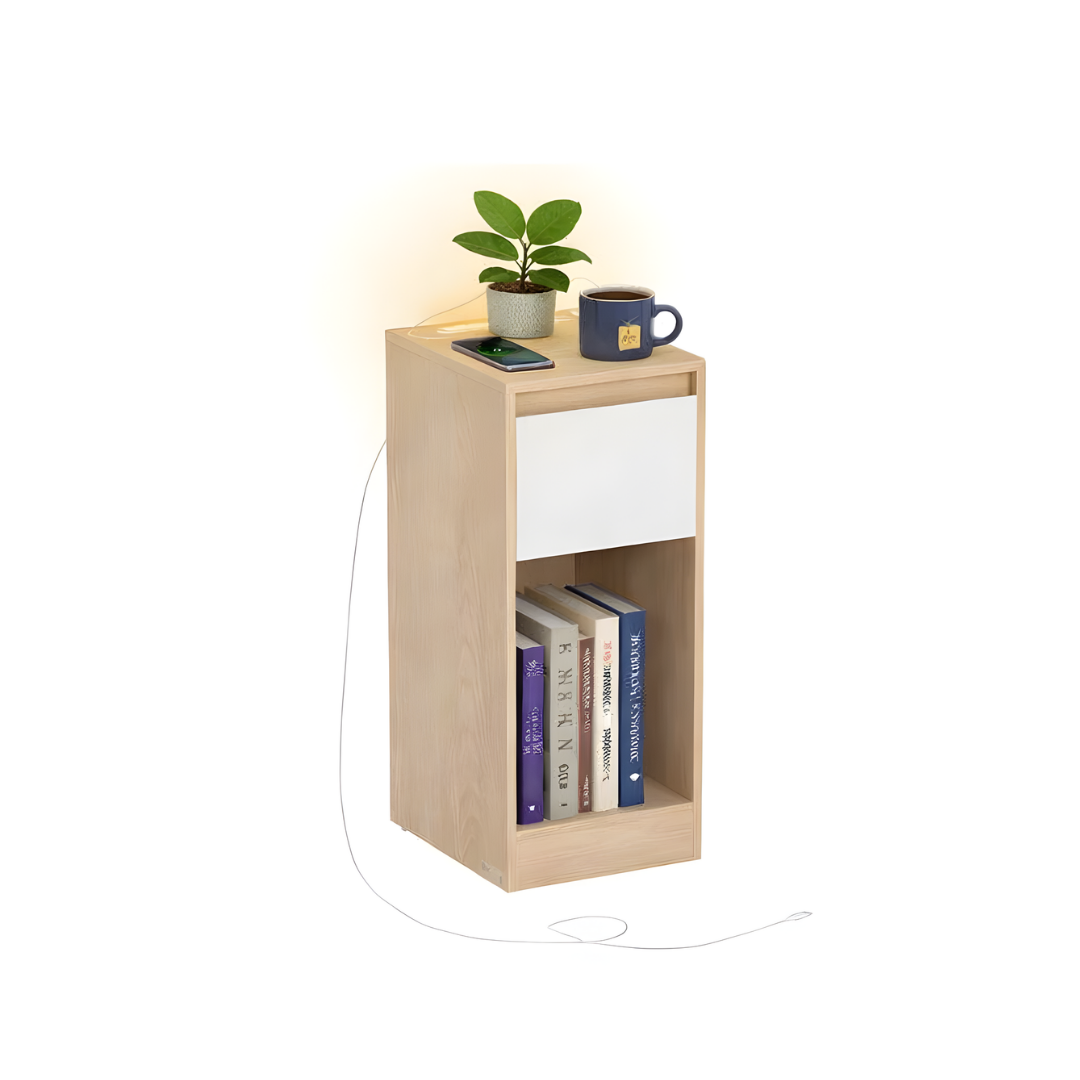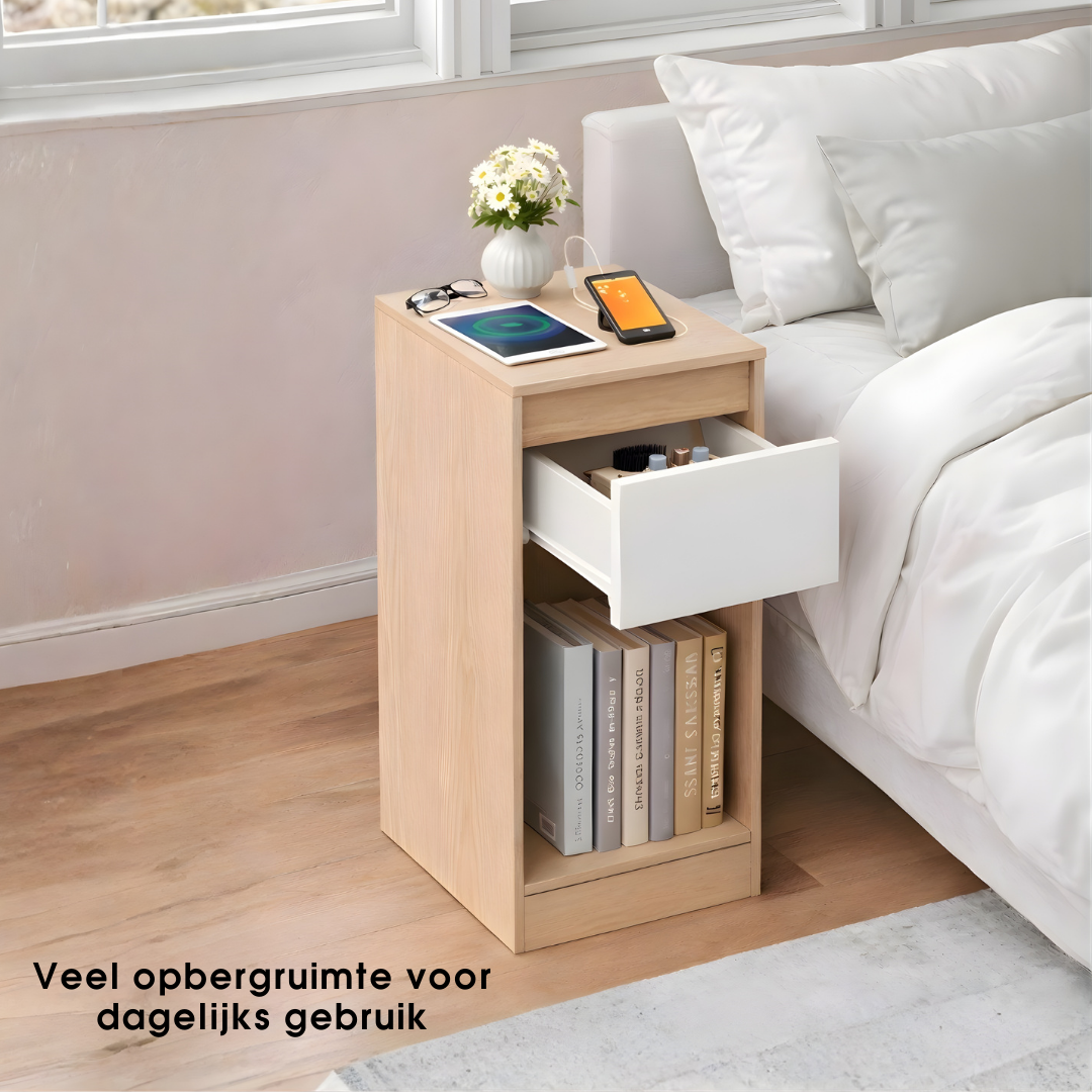Deze bijzettafel heeft een hoge, rechthoekige vorm. Hij is voorzien van een glad tafelblad, een uittrekbare lade en een open plank aan de onderkant. Op de afbeelding is een telefoonoplader te zien die in de tafel is aangesloten.