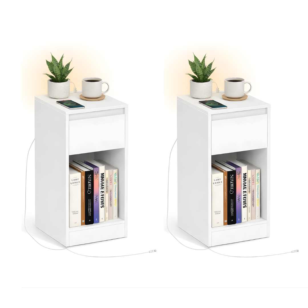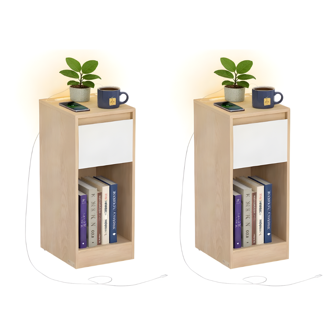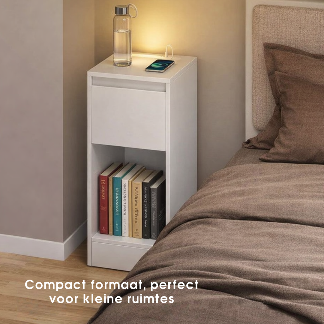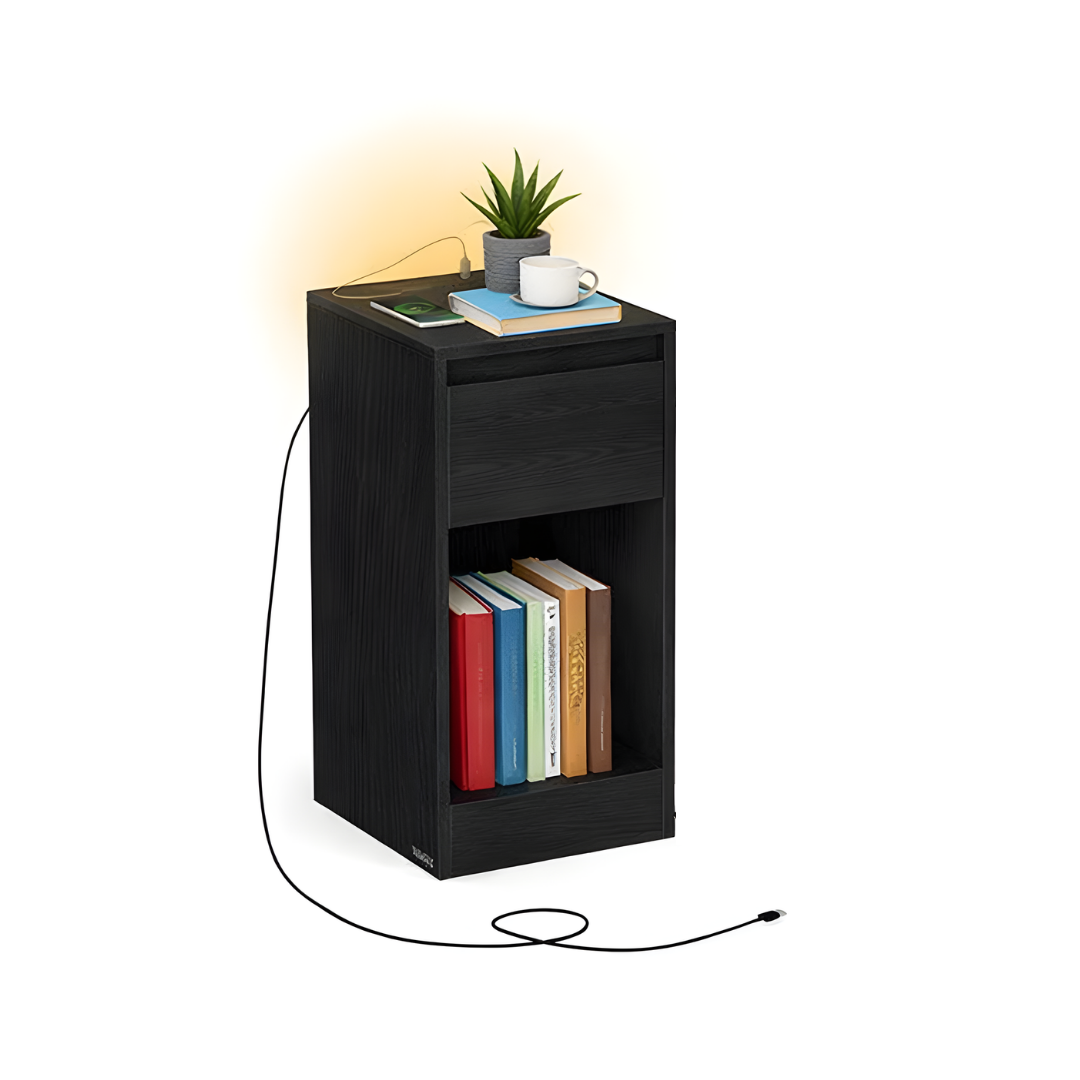 Deze bijzettafel heeft een hoge, rechthoekige vorm. Hij is voorzien van een glad tafelblad, een uittrekbare lade en een open plank aan de onderkant. Op de afbeelding is een telefoonoplader te zien die in de tafel is aangesloten.