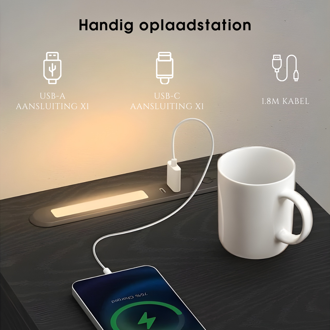 Functie: De tafel heeft een ingebouwde oplaadfunctie. Een stopcontact en een USB-poort zijn in het ontwerp geïntegreerd.
