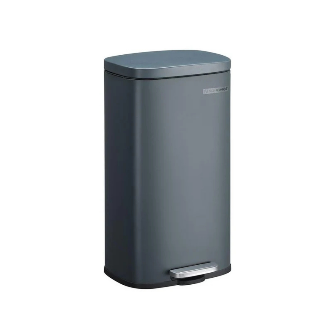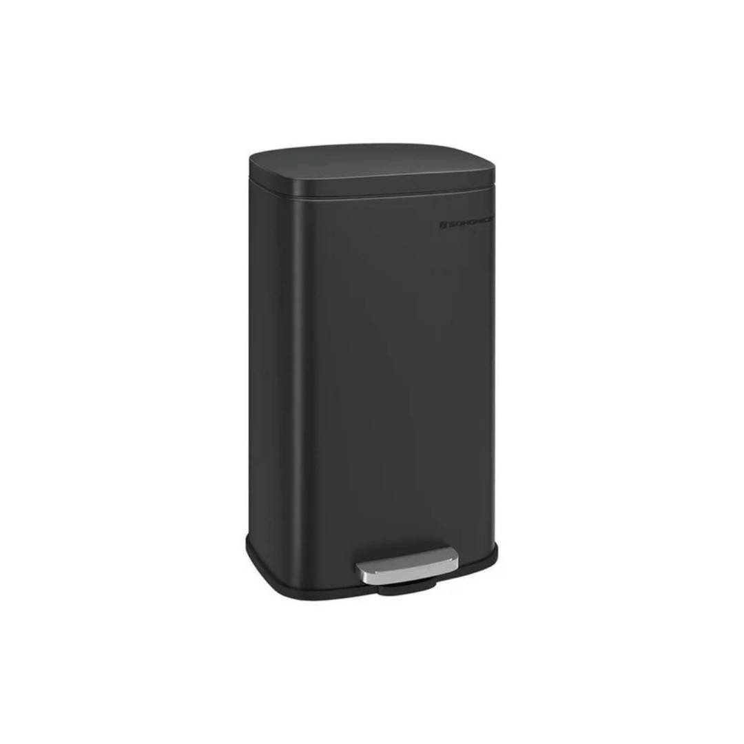 Deze afvalbak heeft een rechthoekige vorm met afgeronde hoeken en een platte scharnierende deksel die omhoog opent. De afvalbak wordt bediend met een breed voetpedaal dat zich aan de onderzijde bevindt. Binnenin de afvalbak bevindt zich een uitneembare kunststof binnenemmer voor het opvangen van afval.
