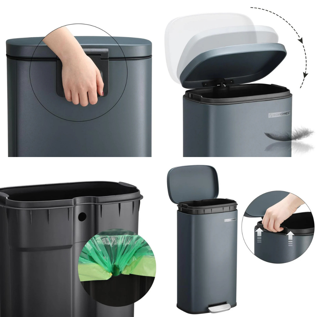 • Voetpedaal: Aan de onderzijde van de afvalbak bevindt zich een breed voetpedaal. Het pedaal is verbonden met het mechanisme van de deksel om deze te openen.