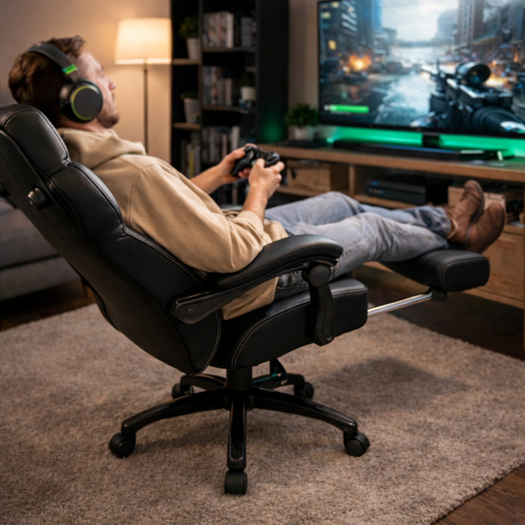 Voetsteun: Een gepolsterde voetsteun is onder de zitting geplaatst. Deze kan naar buiten worden uitgetrokken of onder de stoel worden opgeborgen wanneer deze niet wordt gebruikt.