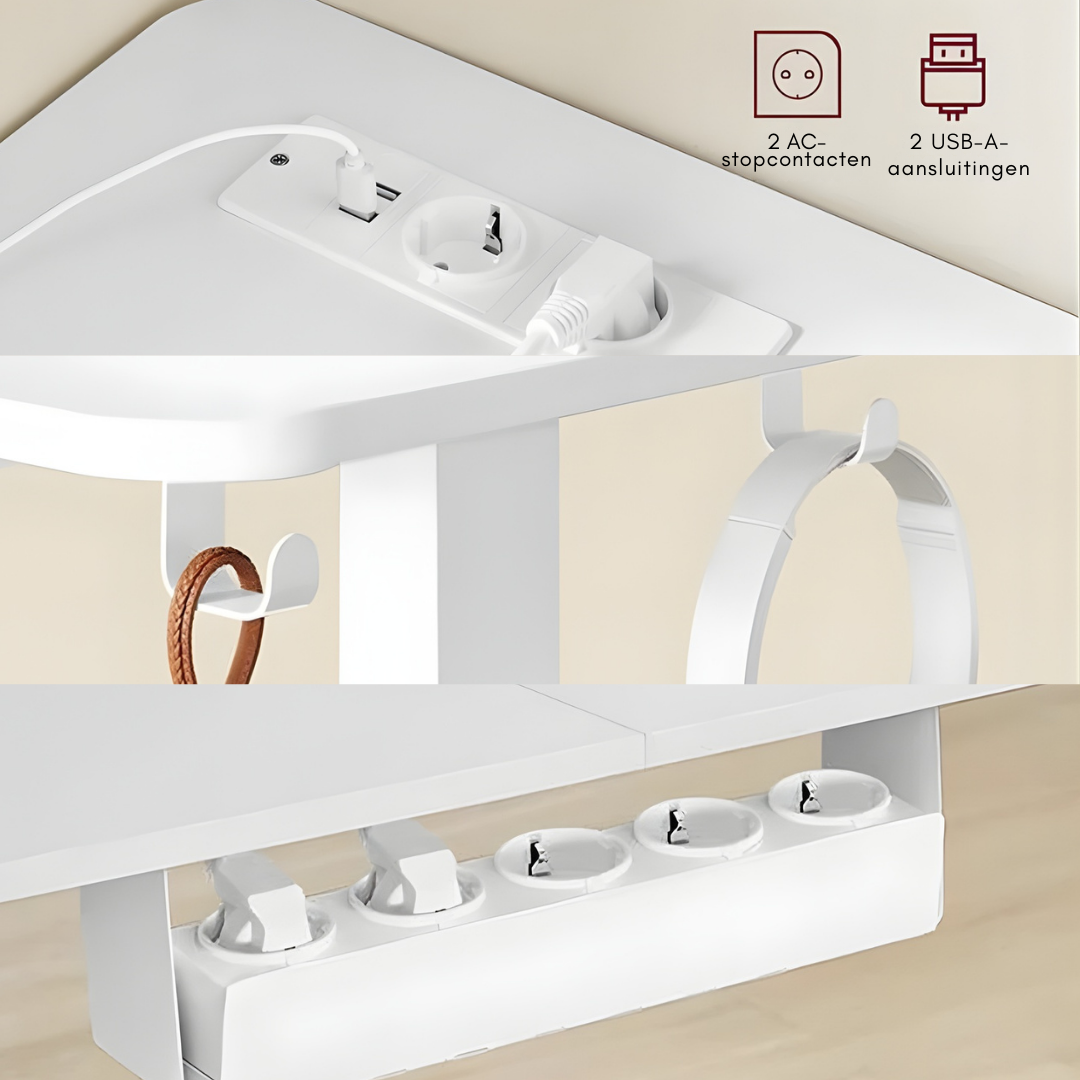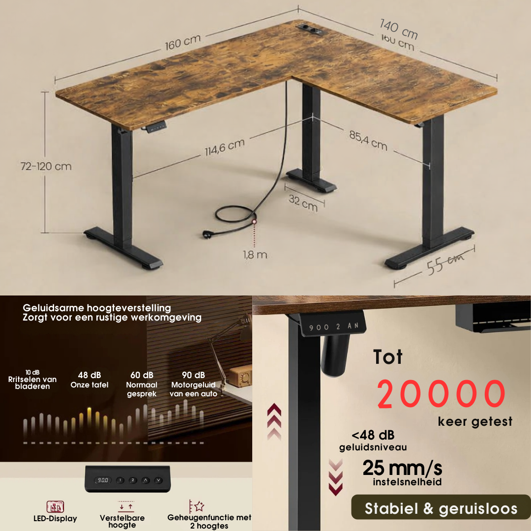 • Frame: Het bureau wordt ondersteund door een gemotoriseerd frame. Het frame maakt hoogteverstelling mogelijk over het L-vormige oppervlak.