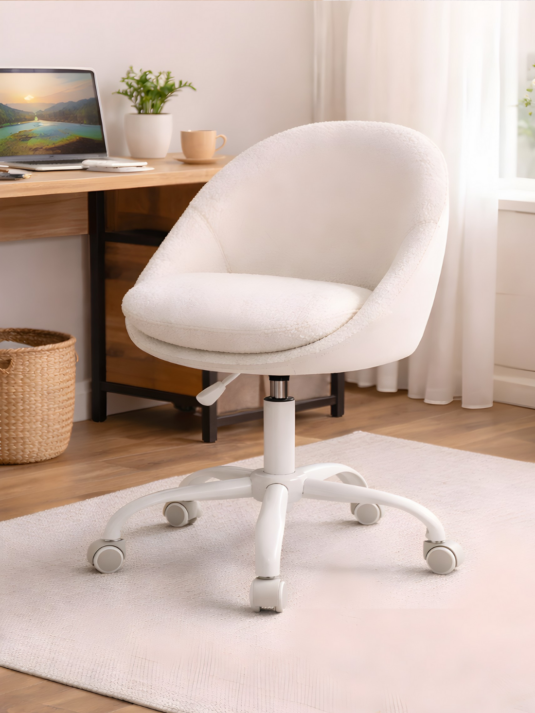 Deze draaistoel heeft een afgeronde rugleuning die naar voren buigt. De zitting wordt ondersteund door een centrale pedestal die is voorzien van een hendel voor hoogteverstelling. De pedestal is verbonden met een vijfbogige basis. Elk van de vijf poten eindigt in een dubbel-wiel caster, waardoor de stoel over vlakke oppervlakken kan worden verplaatst.