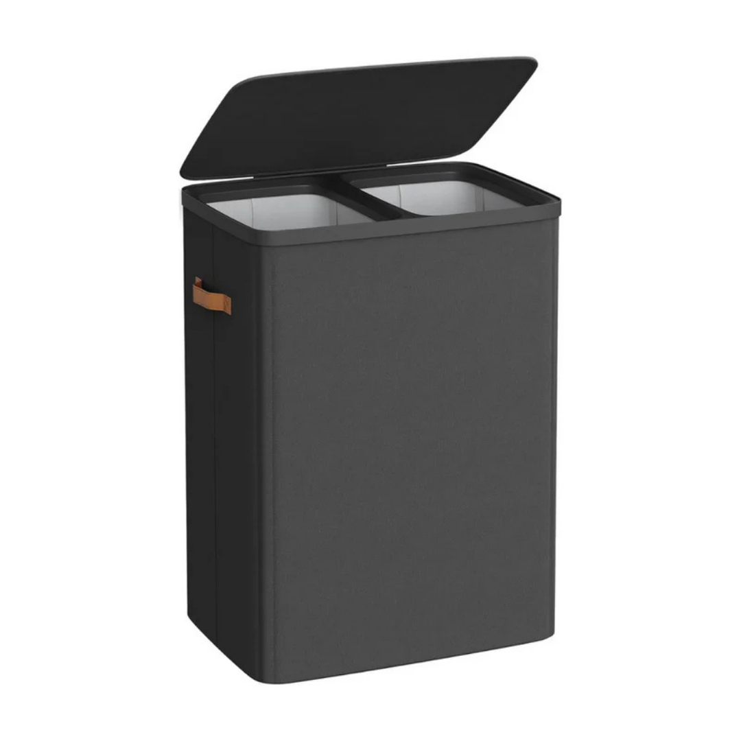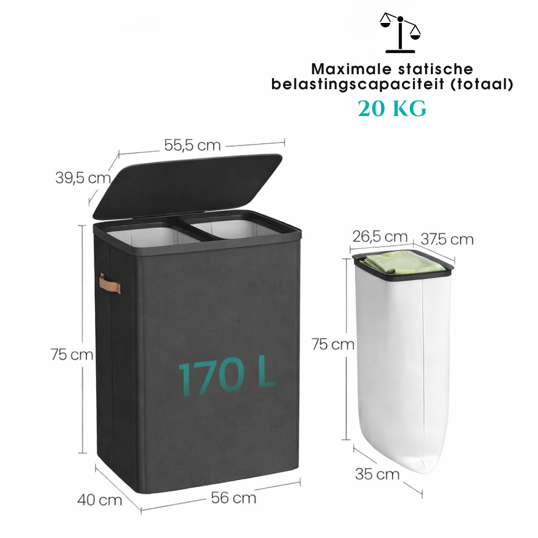 Interne compartimenten: De binnenkant van de wasmand is verdeeld in twee afzonderlijke compartimenten. Elk compartiment is ontworpen om een uitneembare waszak te bevatten.